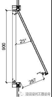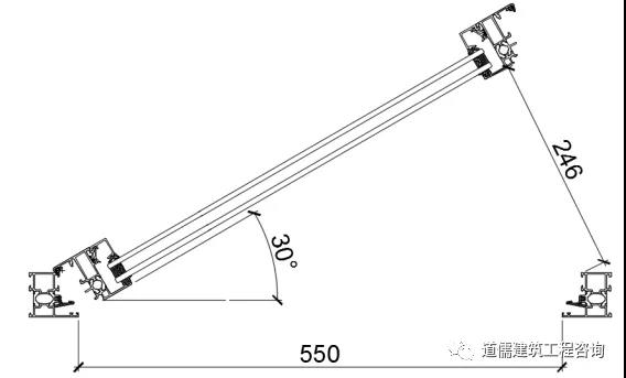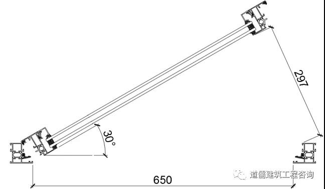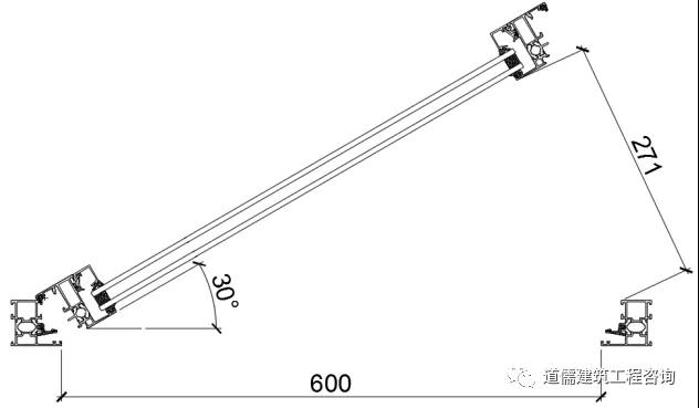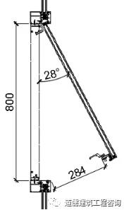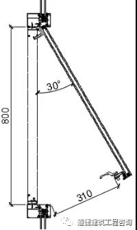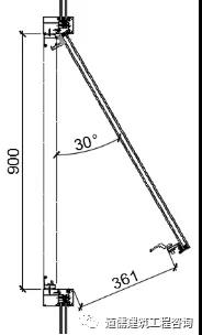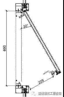 以上外悬窗开启示意图4~图7说明“在开启窗扇设计高度保证不便的状态下,随着开启窗扇的开启角度的变化,开启距离在随着变化,开启设计角度越小那么开启距离也就越小”。
